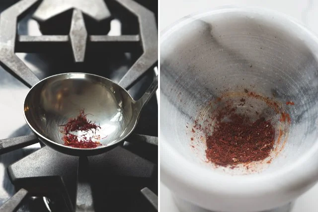- Over low heat, use a metal ladle to toast the saffron. Once the saffron dries out and becomes aromatic, use a mortar and pestle to crush it into a powder. Set aside.