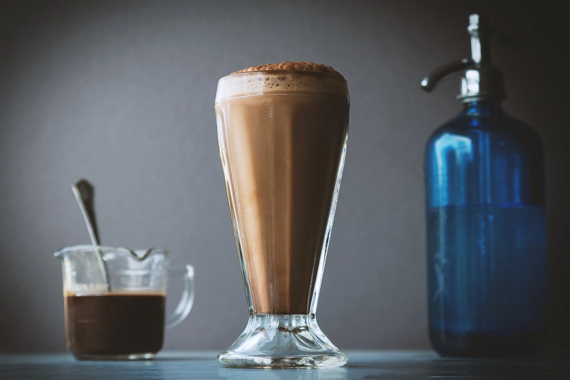 - Add the chocolate syrup and the milk to the bottom of a fountain glass. Top with seltzer water, stir thoroughly to combine, and serve!