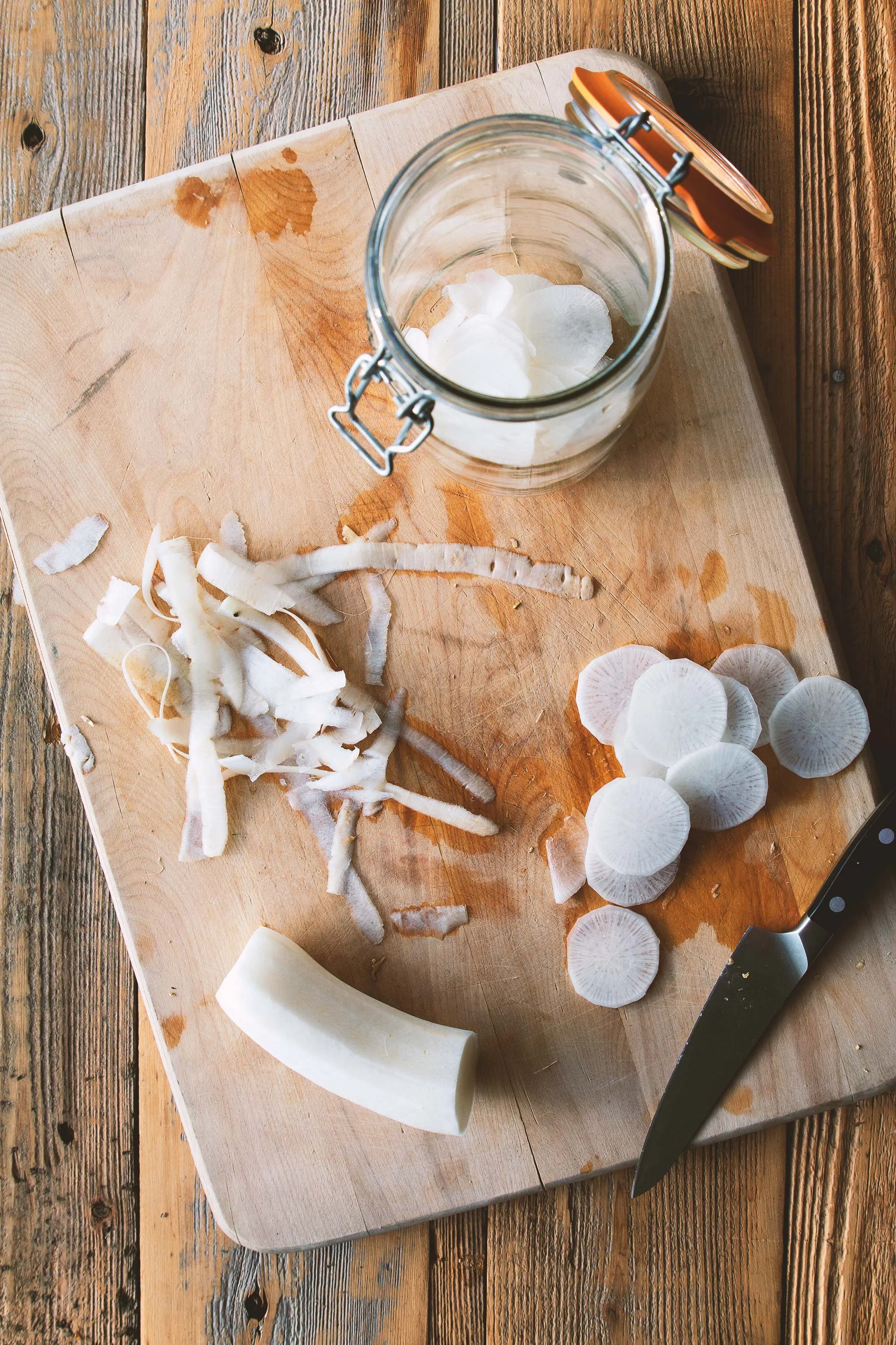 For the pickled daikon: 6-inch daikon, peeled and thinly sliced 2 cups pickling liquid (see below)