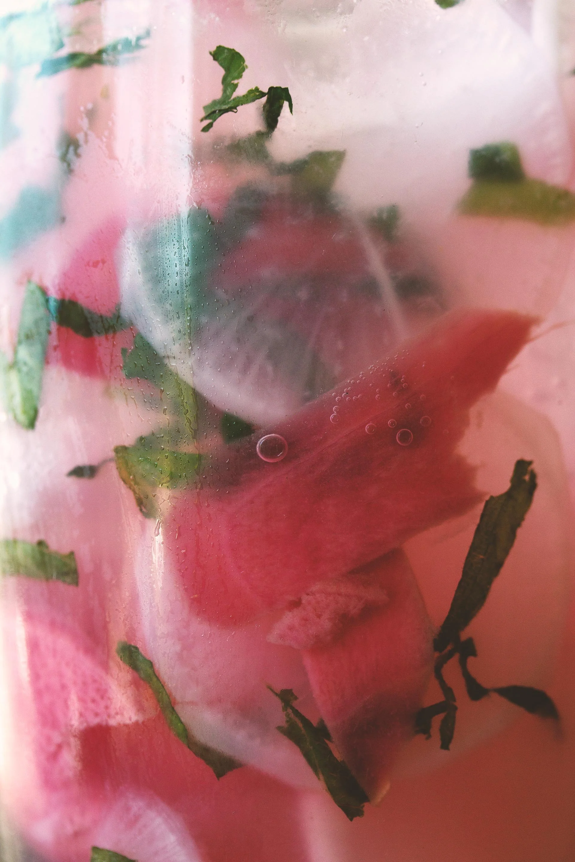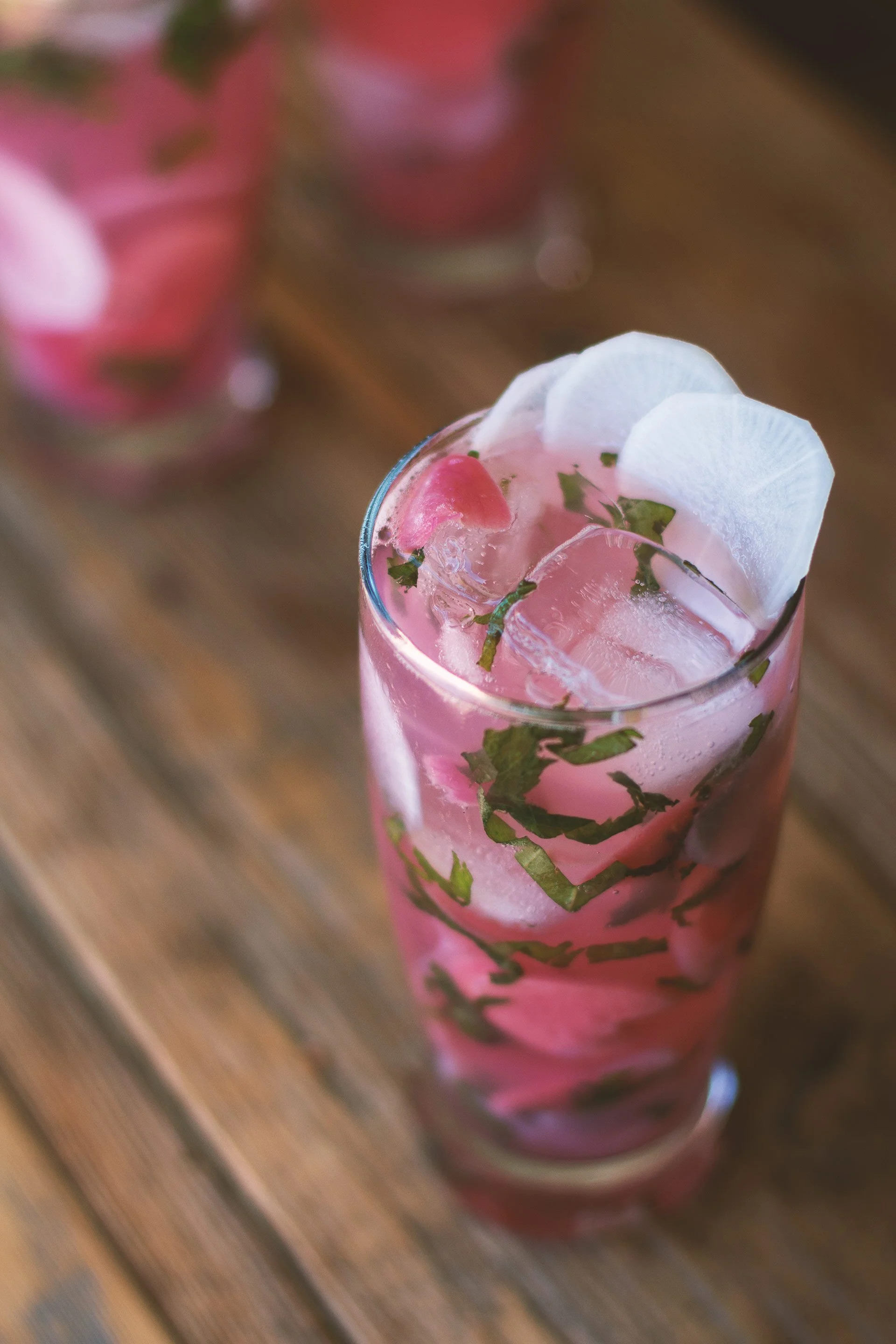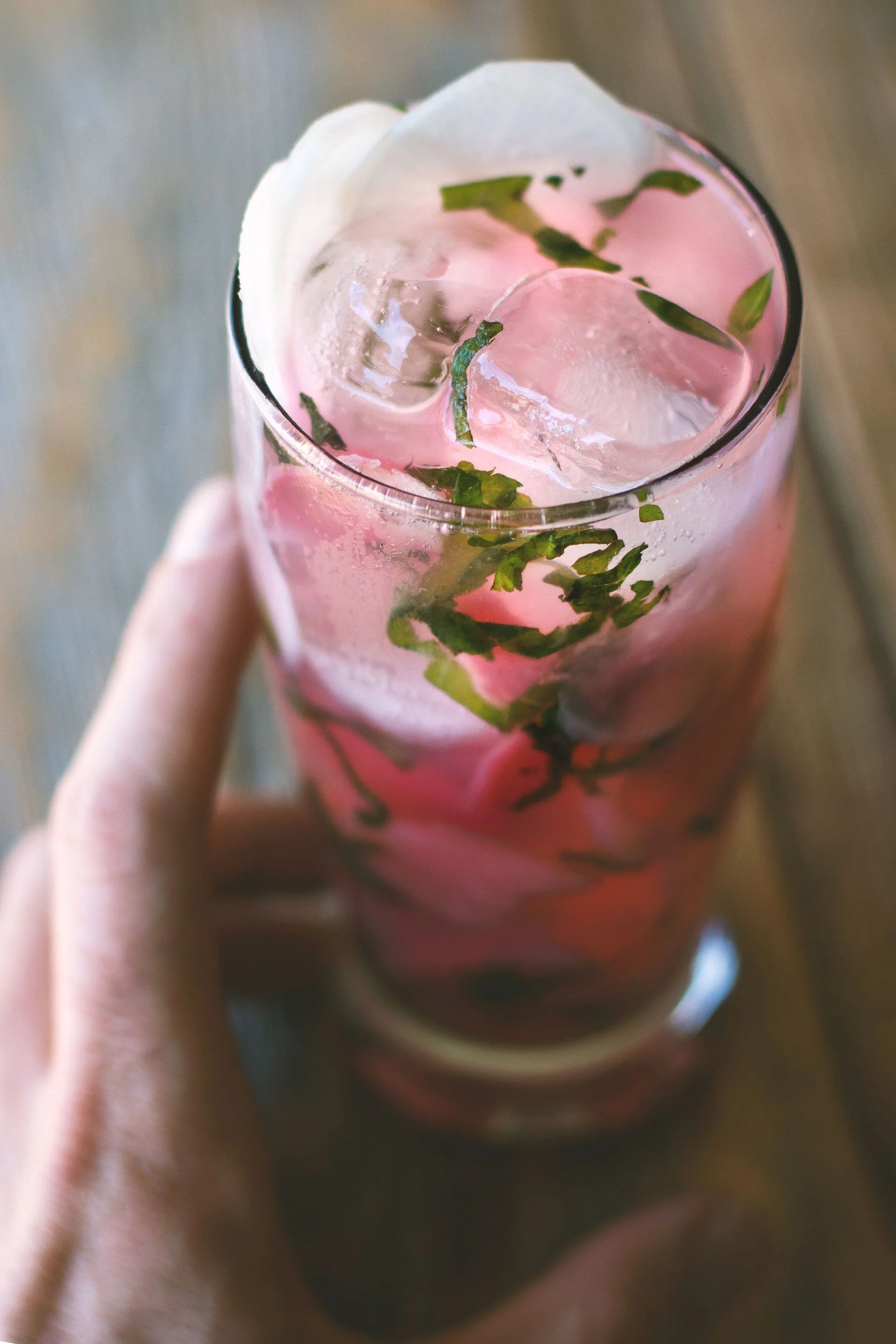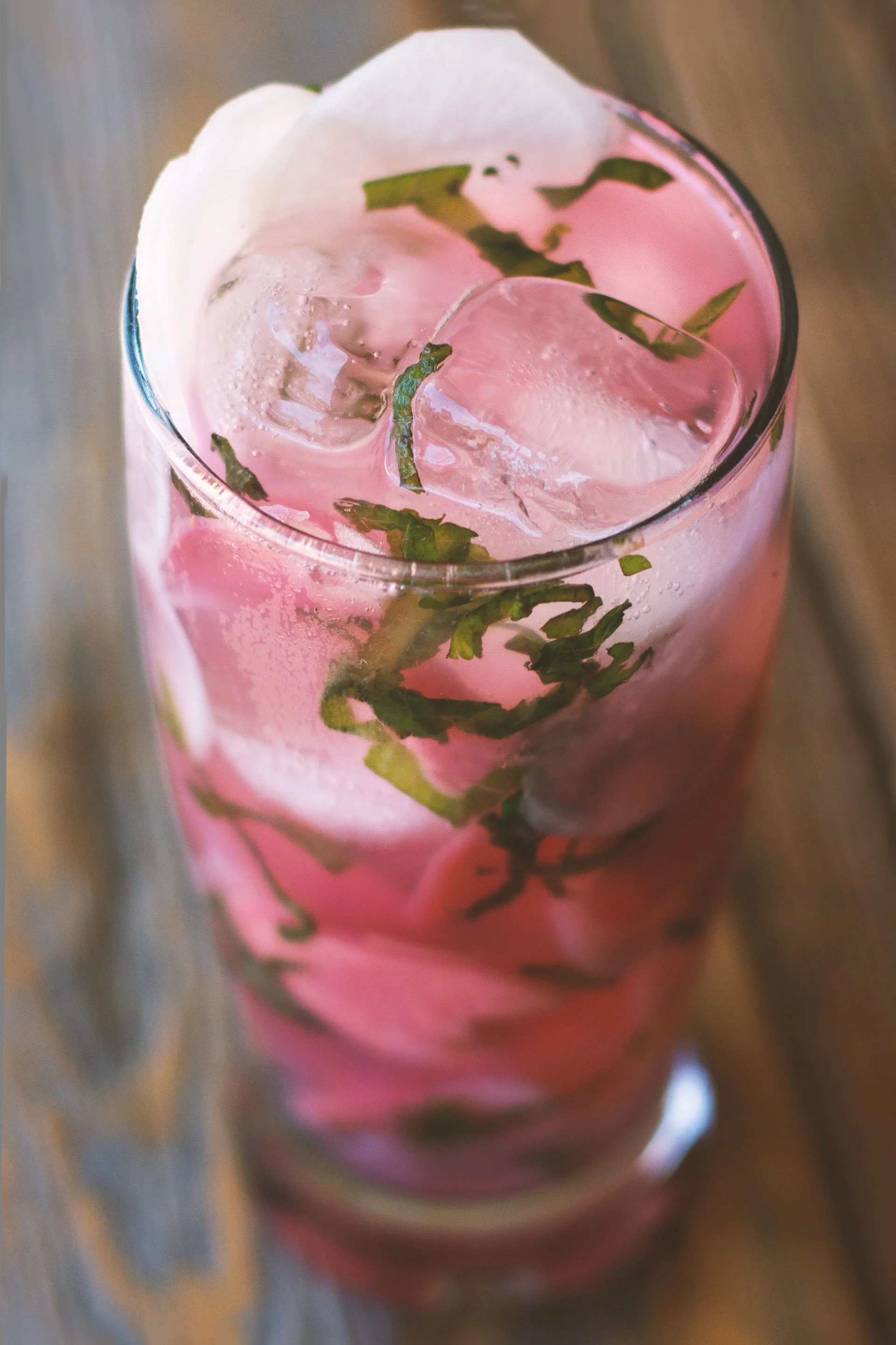 - Add the pickled ginger, daikon, and shiso, then fill with ice.
