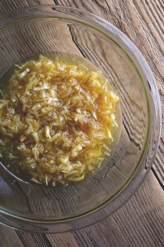 - Strain the mixture through a fine mesh strainer or cheesecloth. Firmly squeeze the shredded apple to extract every last bit of liquid.