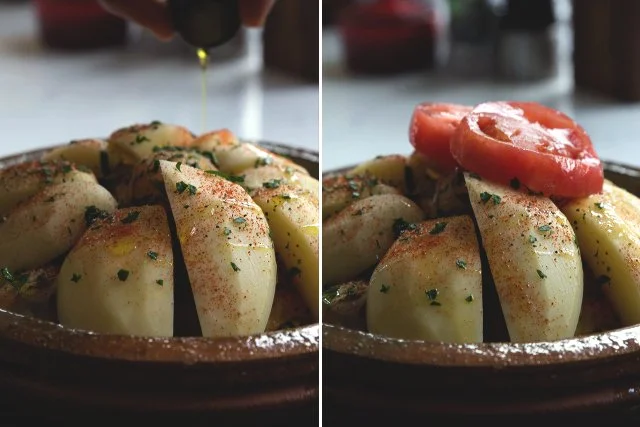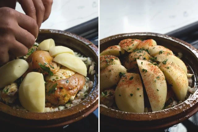 All the work for this dish is in the prep. Gather and prepare all your ingredients ahead of time: marinate the chicken; peel and slice the potatoes; peel the tomato; dice the onion; slice the garlic; chop the parsley and mince the ginger. Once everything is prepped, you’re good to go. Forgive me, as some of the ingredients you see below are not in the tagine, but for the roasted pepper salad that chef Karam made for us - another traditional Moroccan dish.