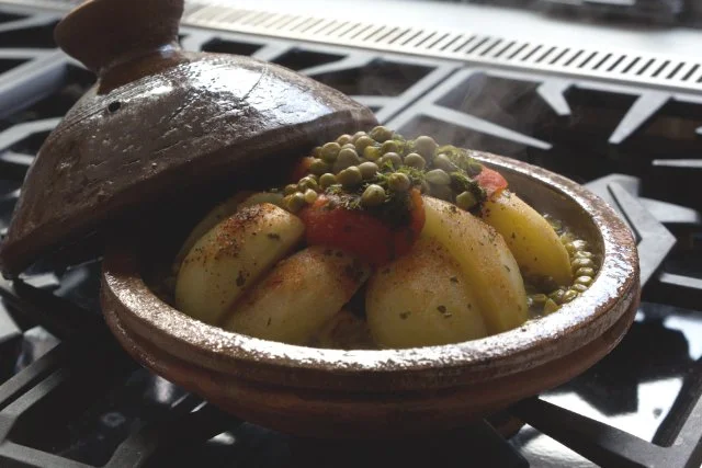 After about 40 minutes, open the tagine and add the peas. While the lid is off, you can stick a fork into a potato or two to check for doneness.