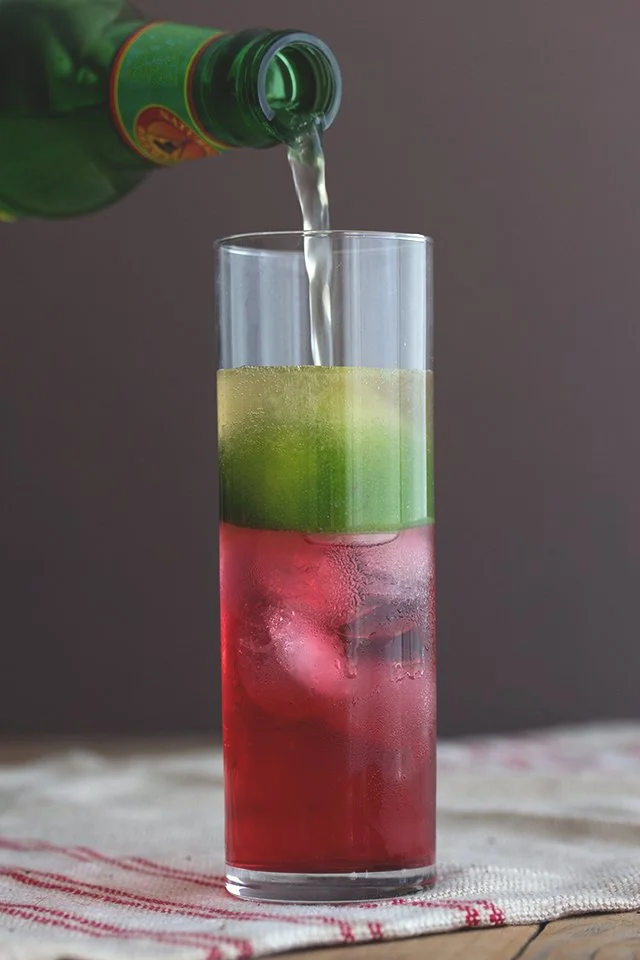 Once the sugar has dissolved, remove from heat and let cool to room temperature. Let the hibiscus and ginger steep for approximately 30 minutes and then strain through a fine mesh strainer. Be sure to squeeze the hibiscus flowers to extract every last drop of yumminess! Set aside.