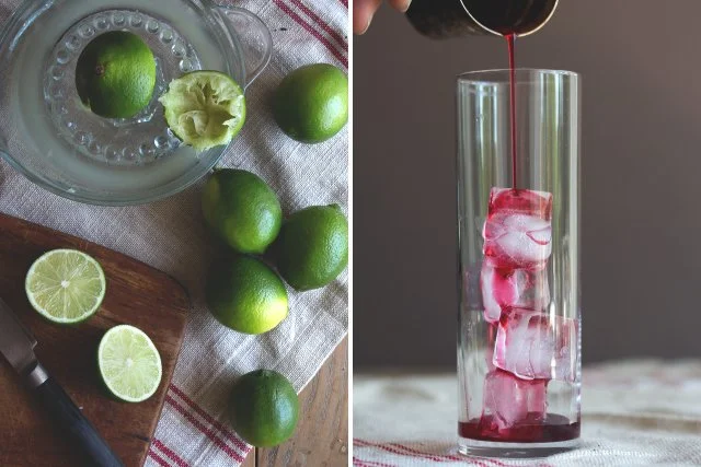Now it’s time for the cocktail. Fill a highball glass halfway with ice. Add the lime juice, hibiscus syrup, and rum.