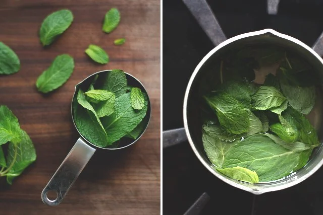 - Once the sugar has dissolved, turn off the heat and add the fresh mint. Stir until all the leaves are coated in syrup and let steep for 15 minutes. Strain into a glass jar and let cool before serving. Store in the fridge for up to two weeks.