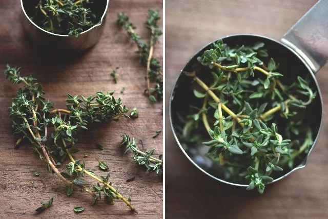- Once the sugar has dissolved, turn off the heat and add the fresh thyme. Stir until all the sprigs are coated in syrup and let steep for 15 minutes. Strain into a glass jar and let cool before serving. Store in the fridge for up to two weeks.