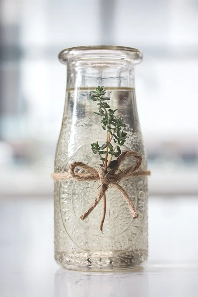 - Remove your herbal syrups from the refrigerator and display next to the beverage dispenser. Tie each herb around its corresponding jar with a piece of twine so your guests can identify which syrup is which.