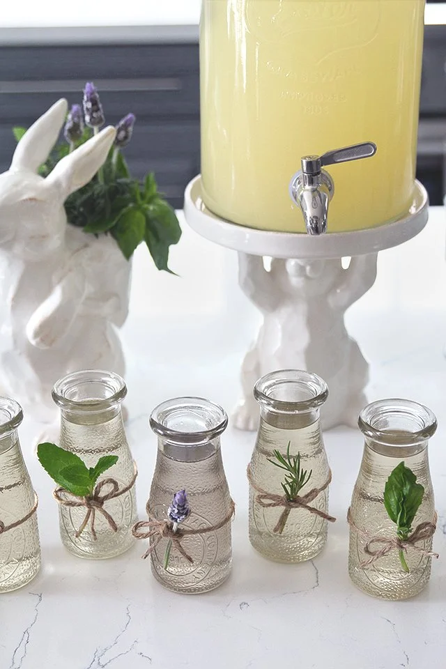 Can you believe that Easter is less than two weeks away? I swear, it feels like I’m still digesting Thanksgiving dinner. I must be getting old. Needless to say, Erica, Karen and I had to celebrate . . . you know how we do it! Two words: Easter brunch. We got you covered. This year, rather than getting all punch-happy I decided to keep it simple but fun with this DIY lemonade bar. I gathered up a bunch of my favorite herbs and made simple syrups. We tied fresh herbs around the corresponding syrups for identification. Then, I displayed each syrup next to a big batch of unsweetened lemonade so that guests are able to customize their own flavor and sweeten to taste. Be sure to check back for more from our Easter brunch, as we share our modern takes on classic Easter recipes. In the meantime, you can head over to Pottery Barn for a sneak peak, as well other entertaining tips.