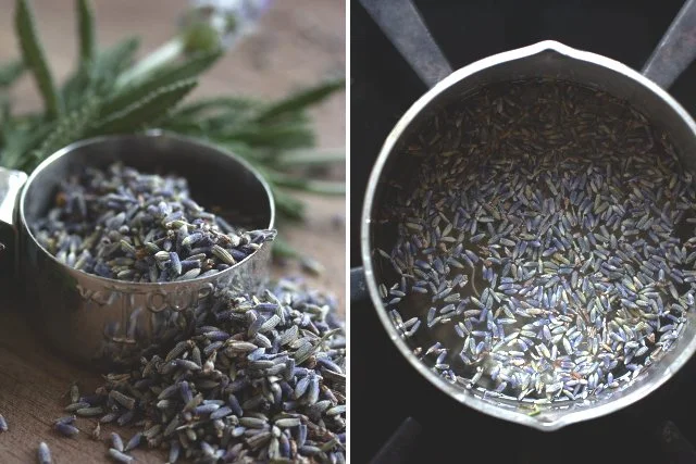 - Once the sugar has dissolved, turn off the heat and add the dried lavender. Stir until all the buds are coated in syrup and let steep for 15 minutes. Strain into a glass jar and let cool before serving. Store in the fridge for up to two weeks.