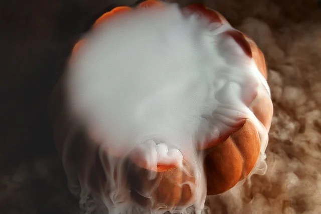 - Now for the fun part. Carefully pour hot water into the bottom bowl so that it contacts the dry ice, thus activating the vapors.