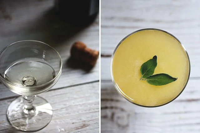 - Double strain (to remove those bits of fruit and herbs) into a coupe glass overtop the sparkling wine. Garnish with a few small pieces of sage and enjoy!!