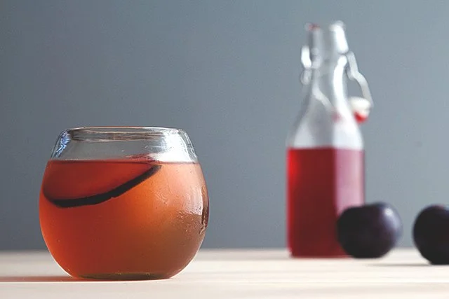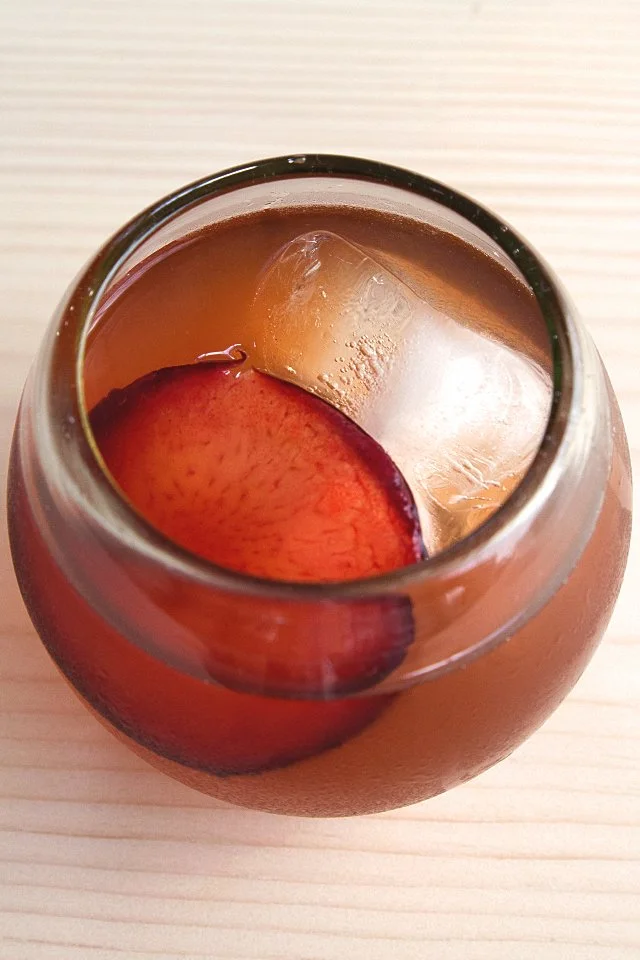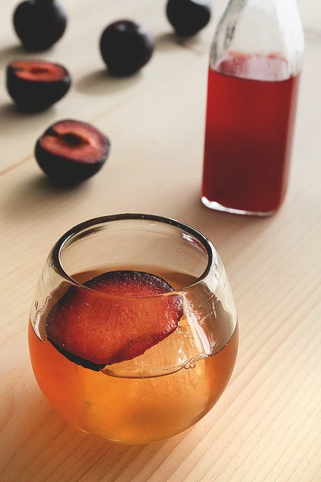 - Strain your cocktail over ice and garnish with a slice of fresh plum.